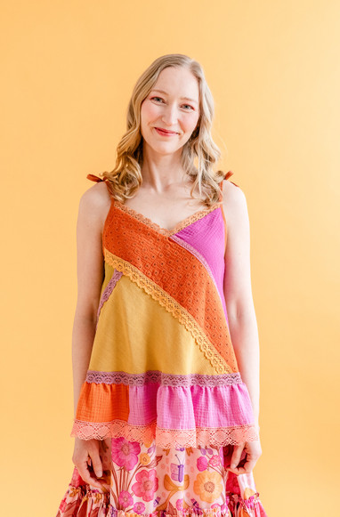 Mamselli-toppi on keveä keijukaisten vaate. Mie rakastan solmittavia nauhoja ja siksi topin olkaimet solmitaan liehuville ruseteille. Tämä Anun toppi ommeltiin erivärisistä musliini- ja pellavatilkuista ja koristeltiin jämäpitseillä. Koska toppi on väljä ja kellotettu, sopii se myös mainiosti päällivaatteeksi, puetpa sen alle sitten mekon tai kauluspaidan.